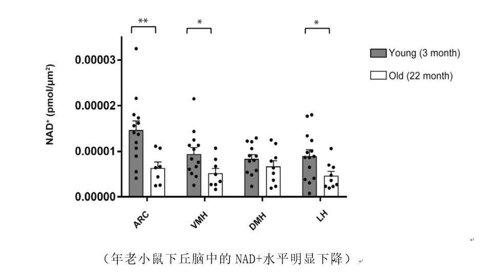 科学家们首先测量了年轻小鼠和年老小鼠的下丘脑NAD+水平,对比发现年老小鼠下丘脑弓状核(ARC)、腹内侧下丘脑(VMH)和外侧下丘脑(LH)内的NAD+水平明显下降。