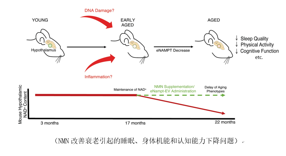 该项研究结果表明:随着年龄的增长,由于炎症和DNA受损等会导致下丘脑功能衰退,NAD+水平下降,进而诱发大脑衰老的各方面问题,如失眠、身体机能下降和认知能力下降等。通过补充NMN补充NAD+,能够恢复并保持年轻时的NAD+水平,明显延缓衰老症状,从而改善睡眠、身体机能、认知能力等。