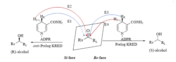 酮还原酶催化氧化还原反应的关键在于辅酶NAD(P)H上的氢原子攻击底物羰基生成产物,而辅酶自身发生氧化的过程。